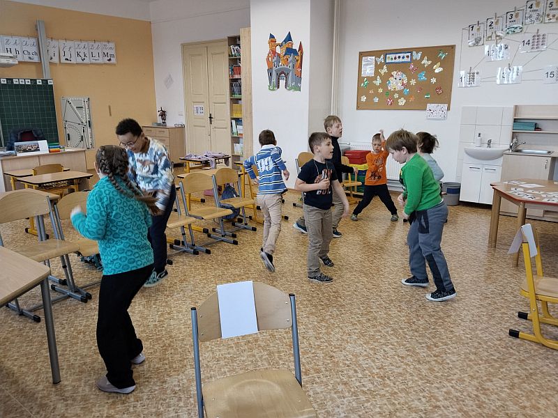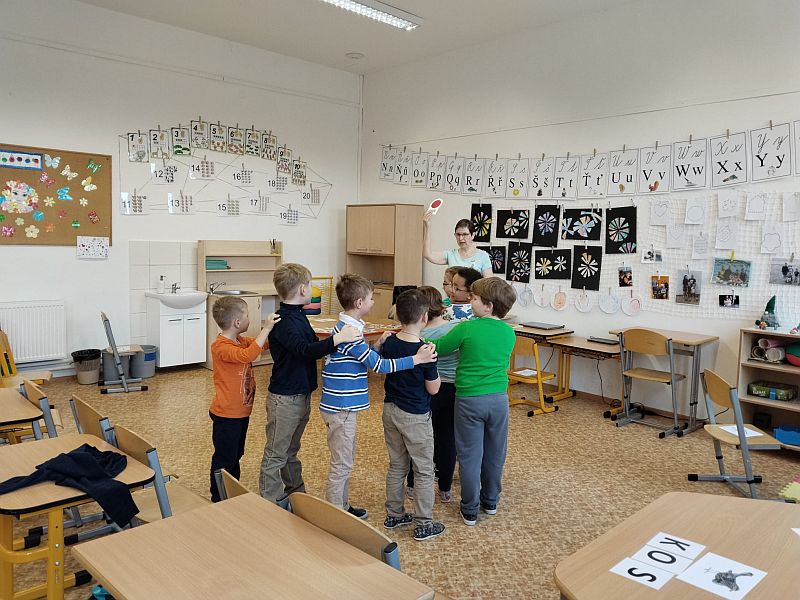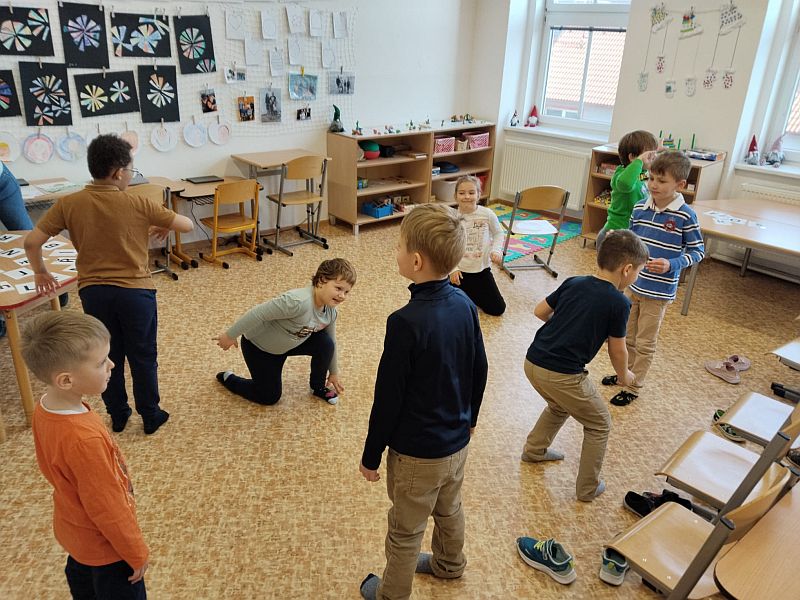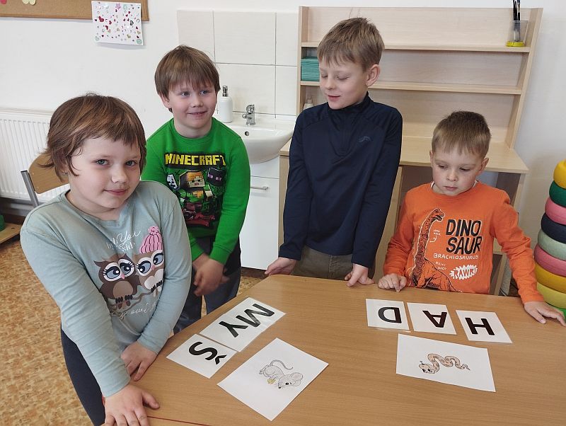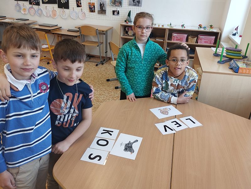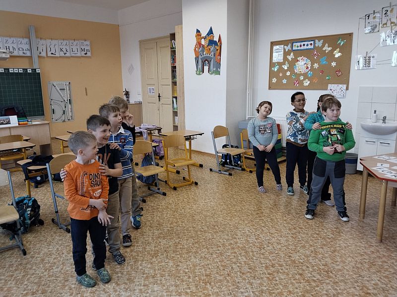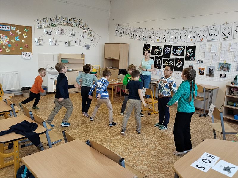 Po přivítání s paní Starou si každý žák vyhledal počáteční písmeno svého jména. Poté třídou hrála píseň „Máme rádi zvířata“, u které děti při náhodném zastavení hádaly ukázaná zvířata, čímž se skvěle dostaly do tempa. Ve dvojicích následně skládaly jména zvířat z jednotlivých písmen.